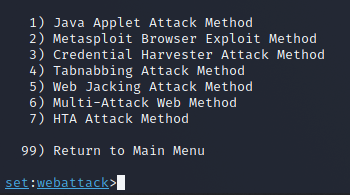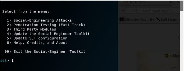 - A menu pops up. Enter 1 as the choice as in this demo we attempt to demonstrate a social engineering attack.